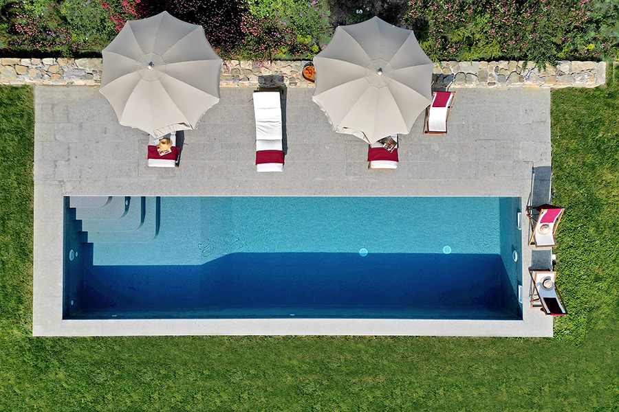 The grounds are equally captivating, with a swimming pool nestled on a lower terrace, accessed by a gentle slope and complemented by an outdoor shower. A terrace in front of the kitchen is equipped for outdoor meals. Guests can choose between an authentic stone-built pizza oven or a modern barbecue.