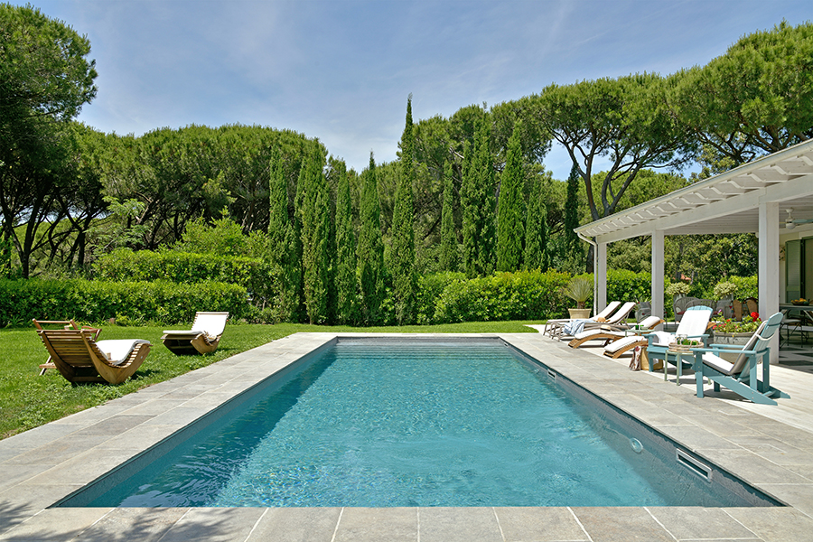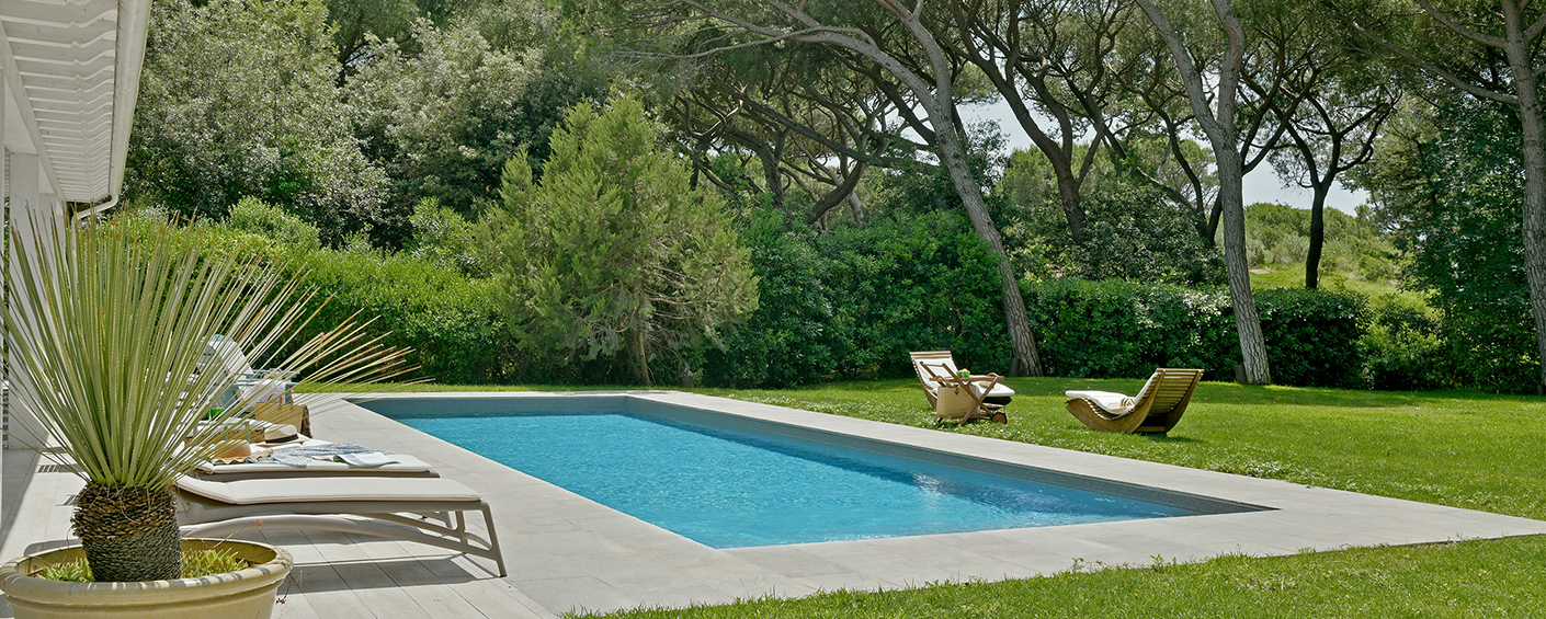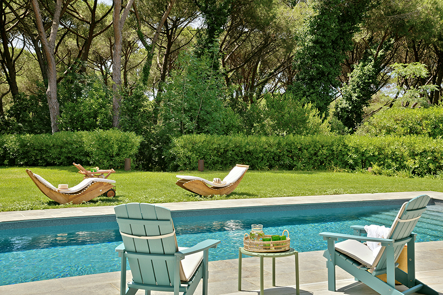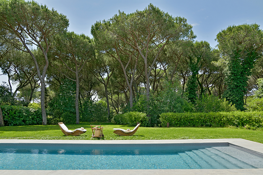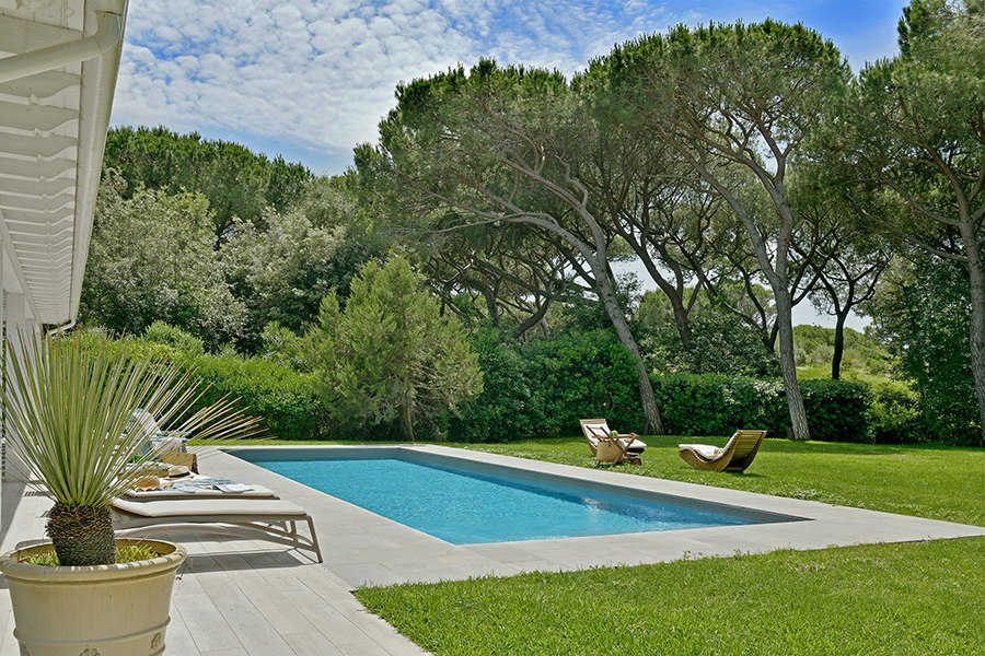 The verdant garden has both shady and sunny areas which you can savor while lounging on a sunbed or reading in a comfy garden chair, and there is a small pool. A private path through the pine grove takes you to an unspoilt beach (100 m) where there is a private cabana, parasol, towels and sunbeds for villa guests.