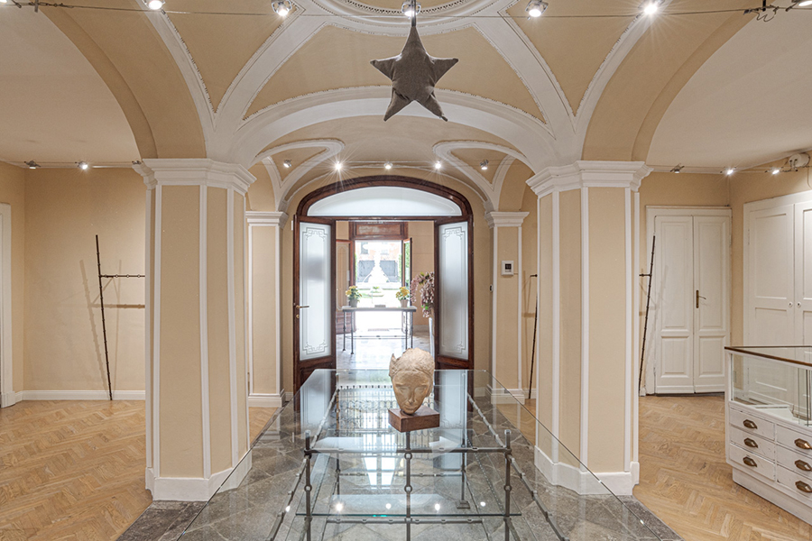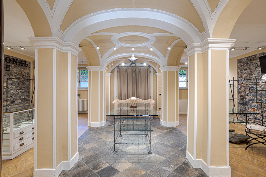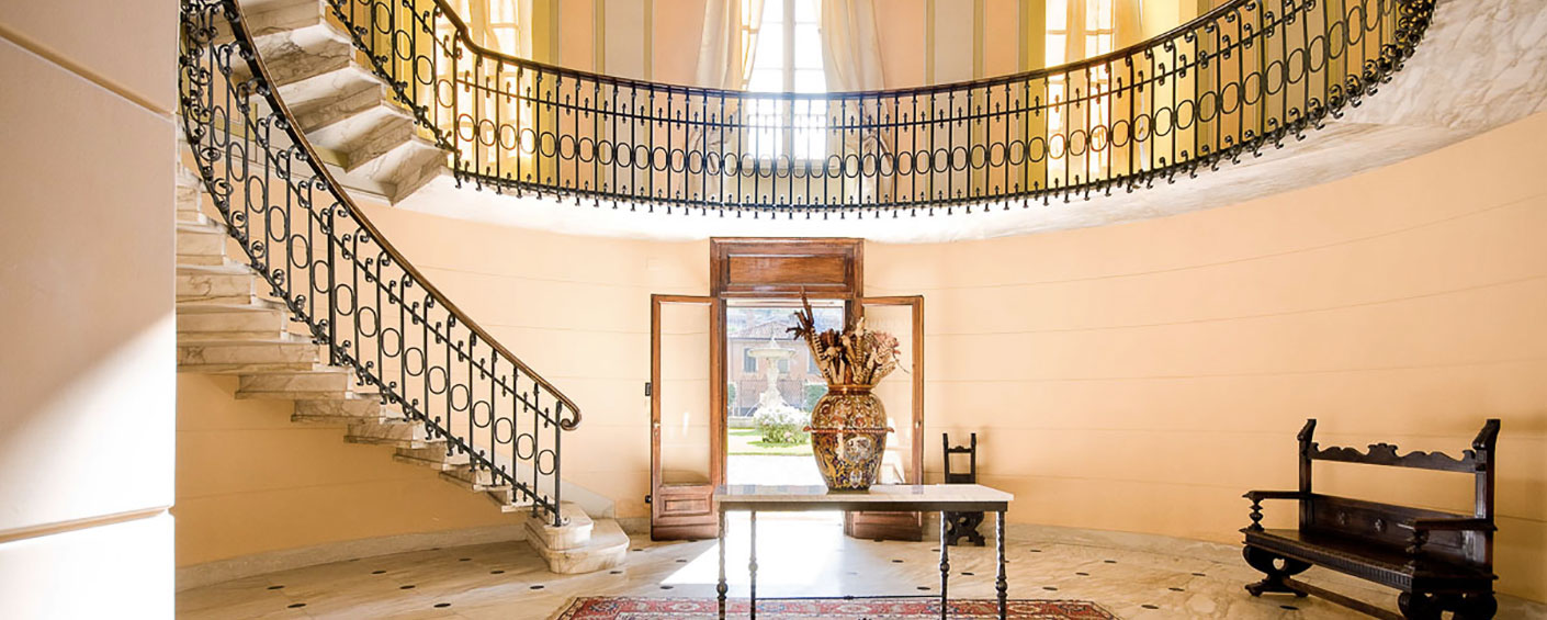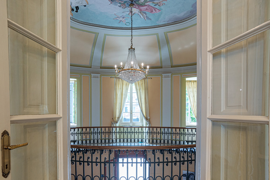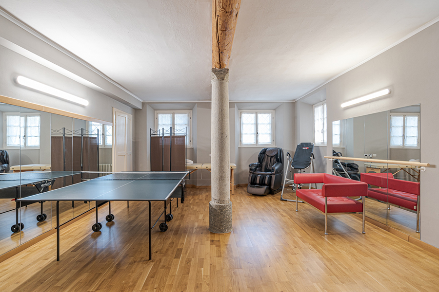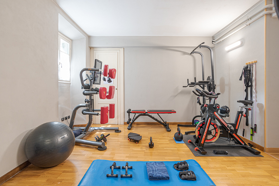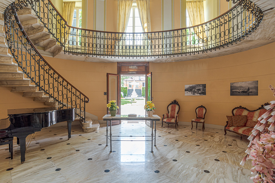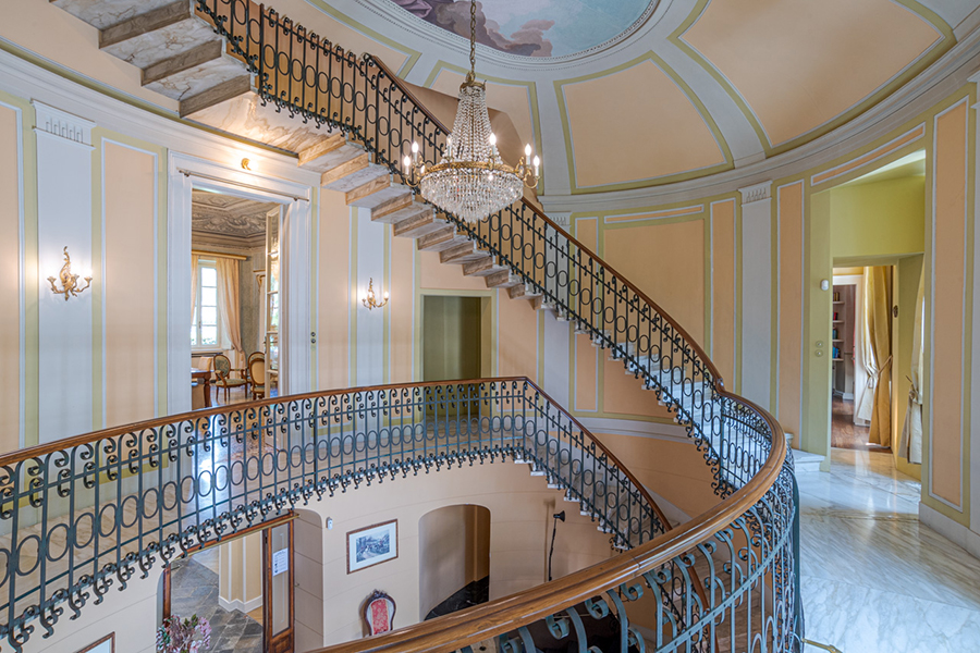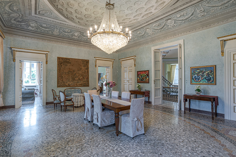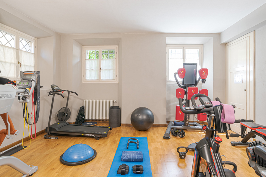 The villa is accessed by a large marble foyer with a circular marble staircase and an imposing chandelier hanging from a ceiling with hand-painted frescoes (some of which by Andrea Appiani, Italy's most famous neo-classical artist). The foyer leads to a gym with parquet flooring, yoga balls, mats and other equipment.