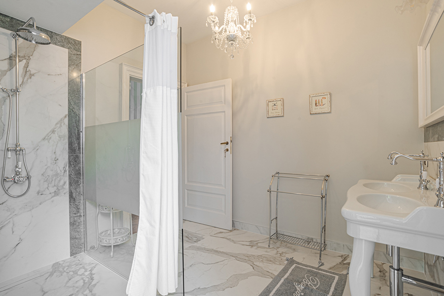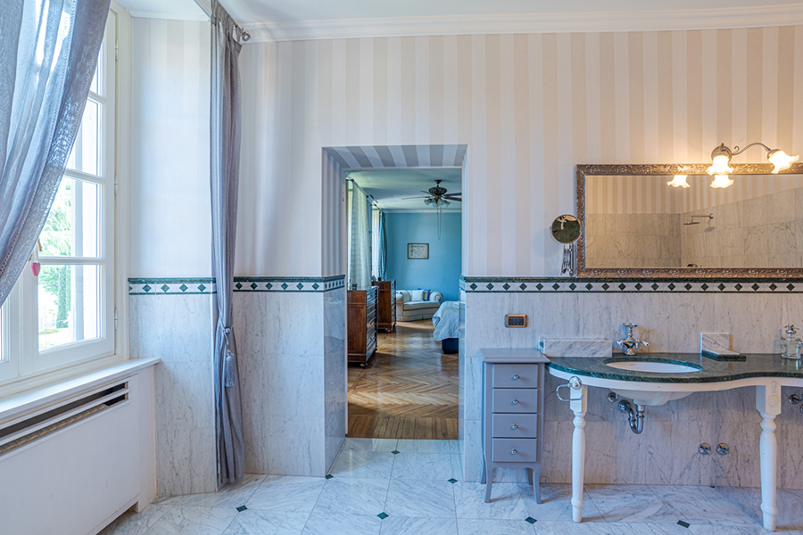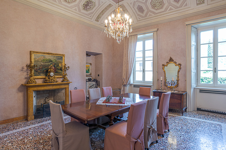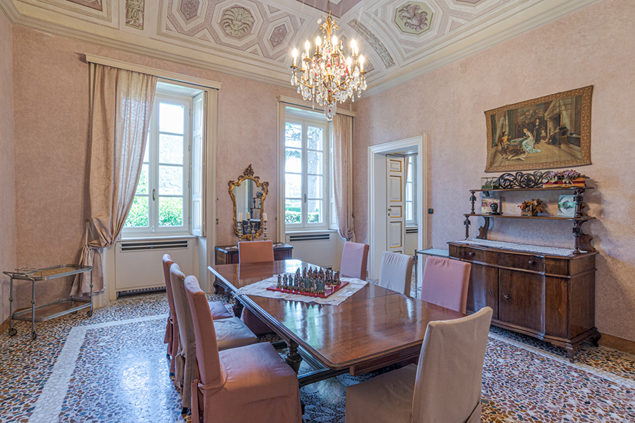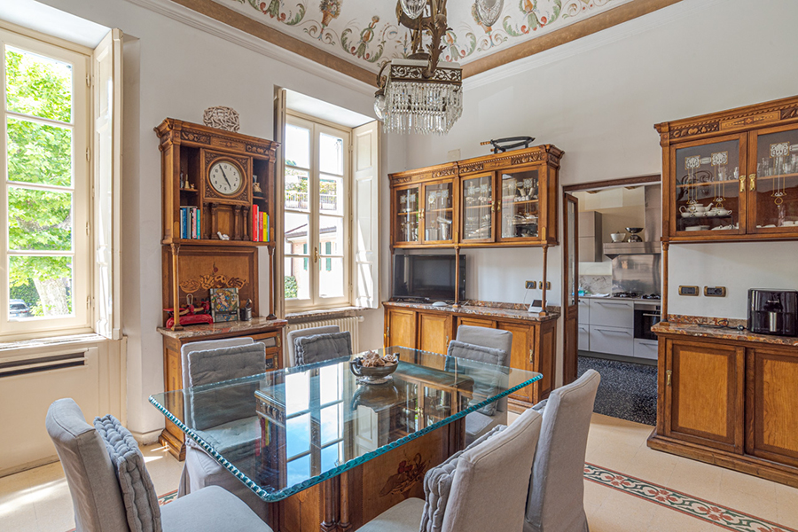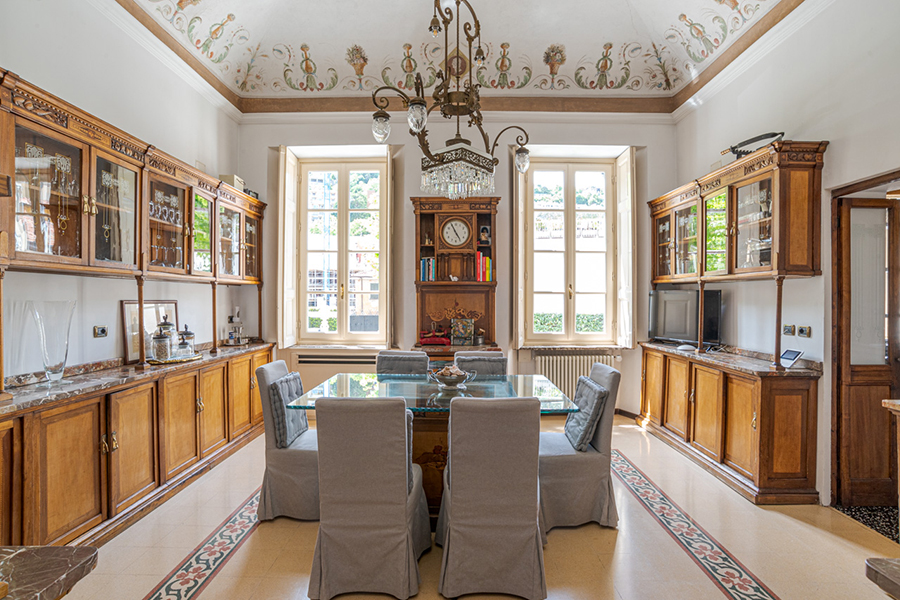 The living room has marble floors, high ceilings, antique furniture, a large chandelier and direct access to the garden overlooking the lake and a path to a lakeside promenade. Furthermore there are a formal dining room and a fully equipped gourmet kitchen.