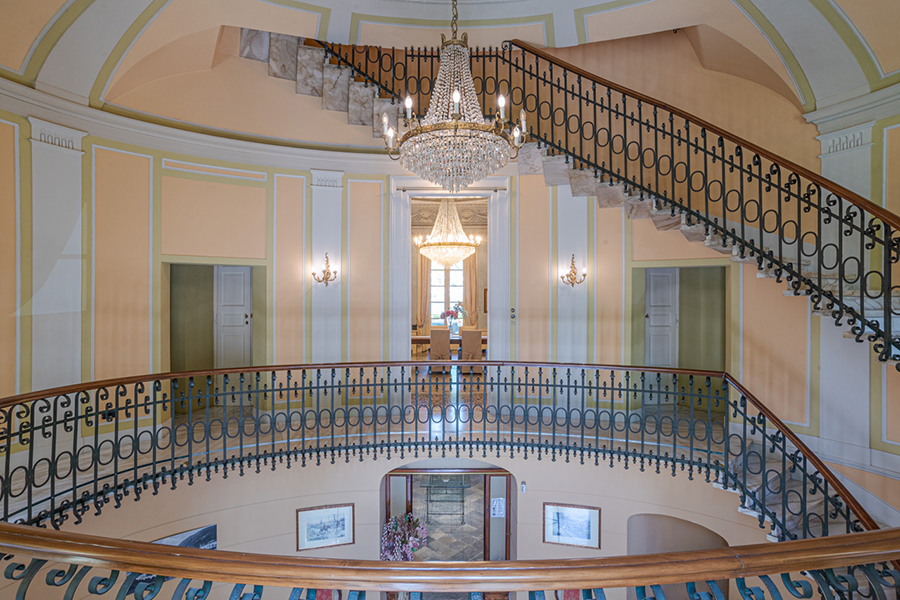 - Grand foyer with 20-foot frescoed ceiling and spiral marble staircase