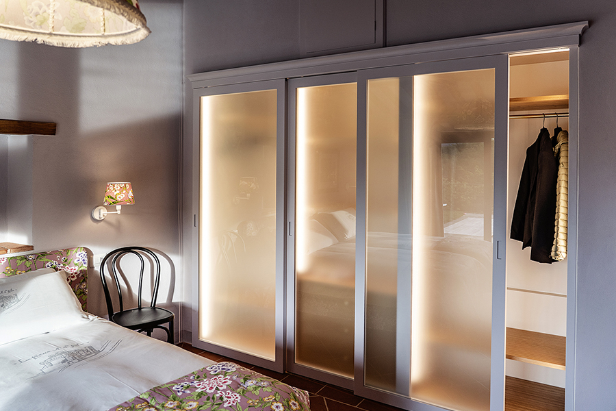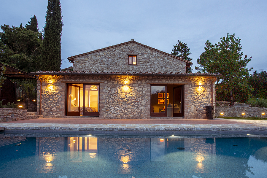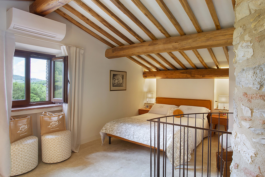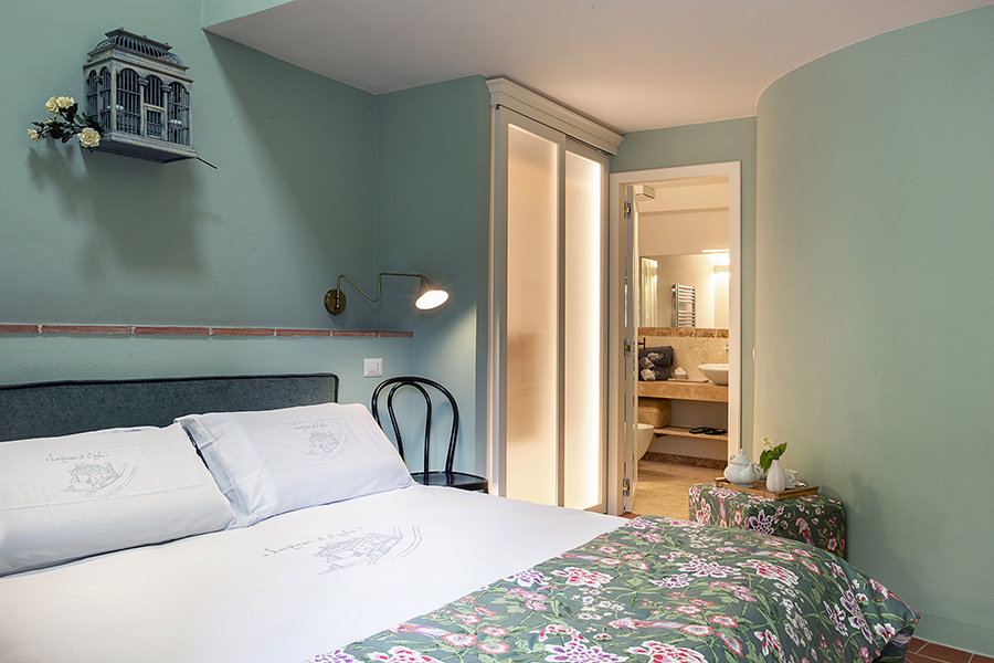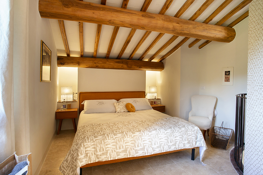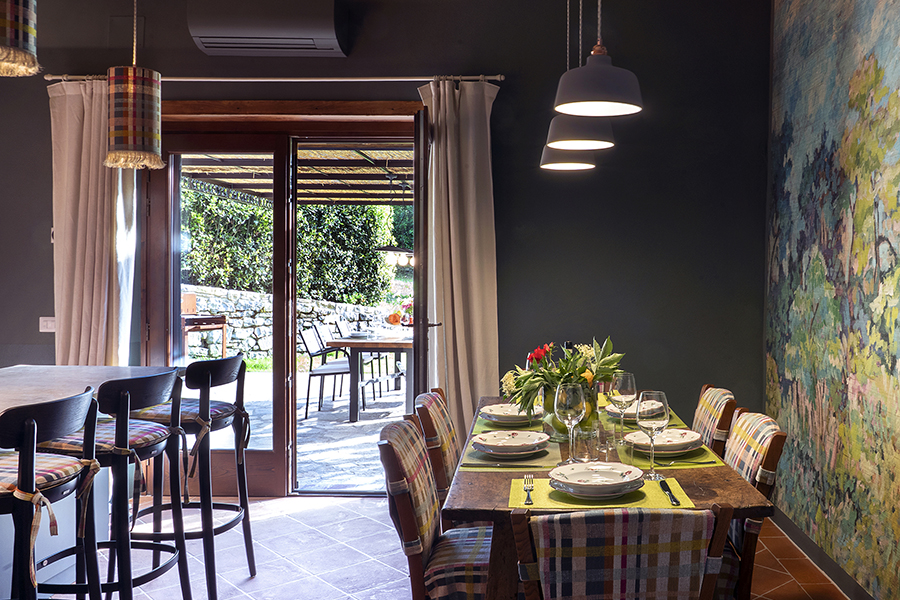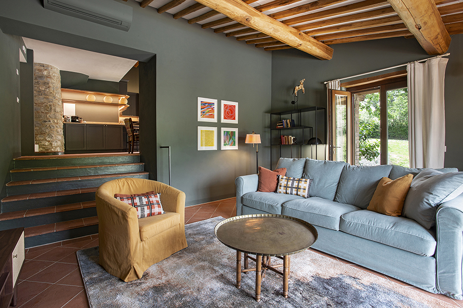 The interiors combine classic Tuscan elements, such as terracotta floors and exposed wooden beams, with pastel-colored walls and elegant furnishings, creating bright, inviting spaces that feel both timeless and refreshingly modern.