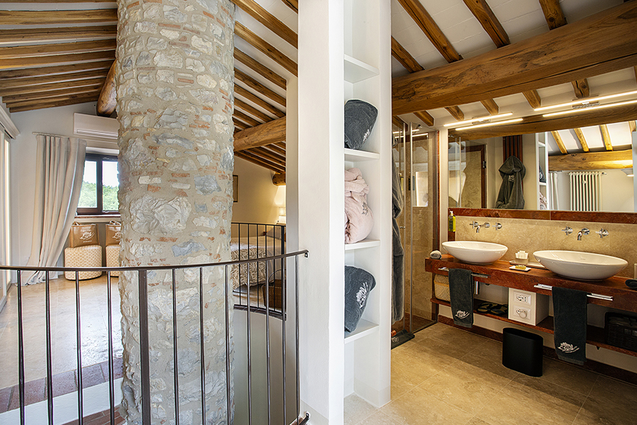 Outside, a lush 2,500 m² garden wraps around the villa. Here, a sparkling saltwater pool — heated on request - invites long, lazy afternoons on sun loungers beneath parasols, with uninterrupted views over the Chianti countryside. A traditional pizza oven, BBQ, and a shaded pergola complete the setting, perfect for relaxed al fresco meals and memorable evenings under the Tuscan sky.