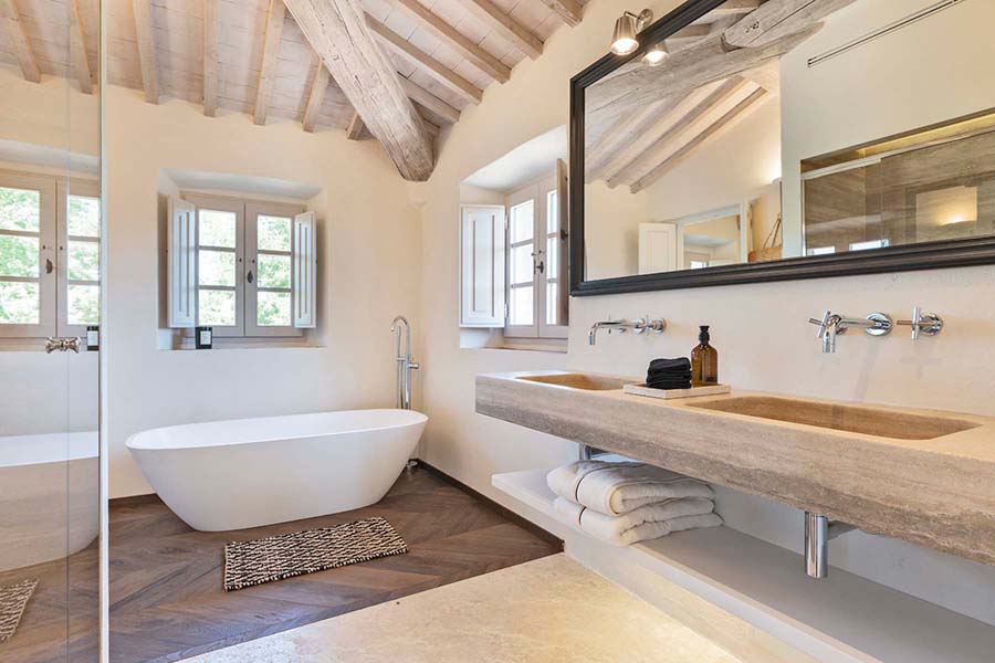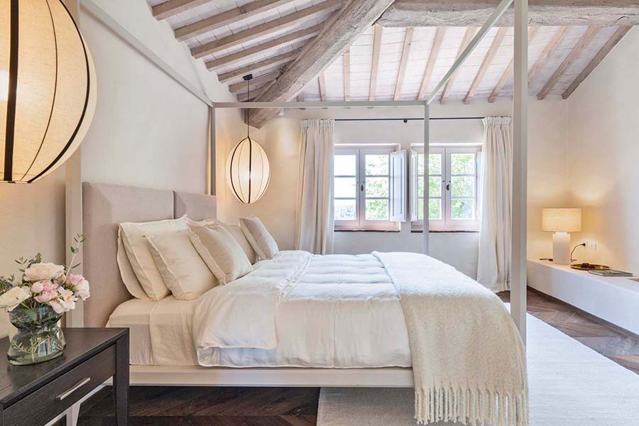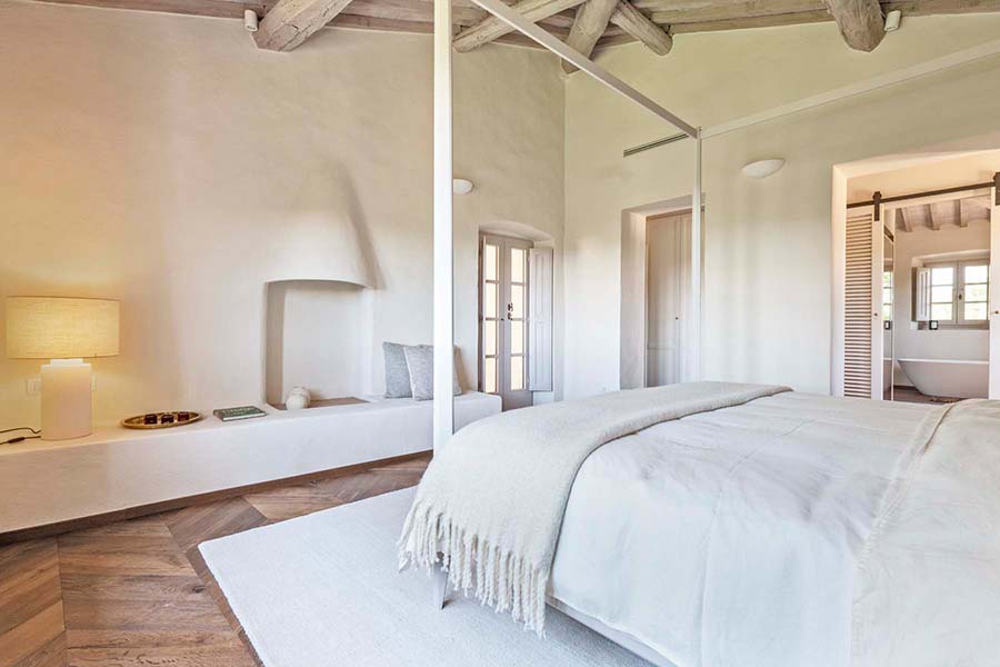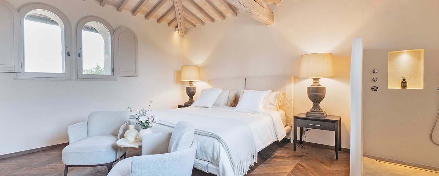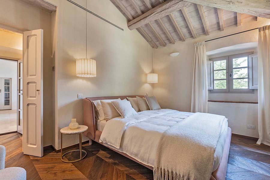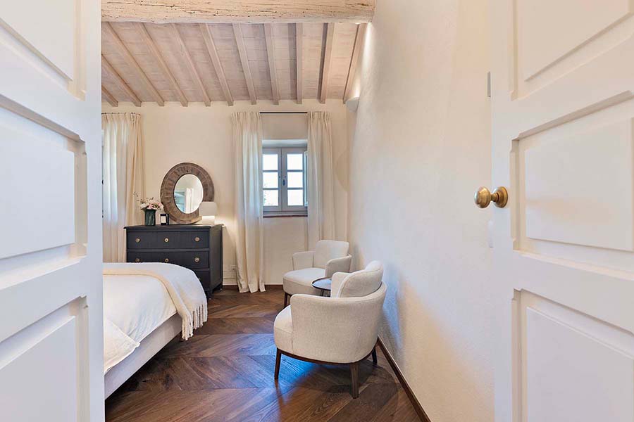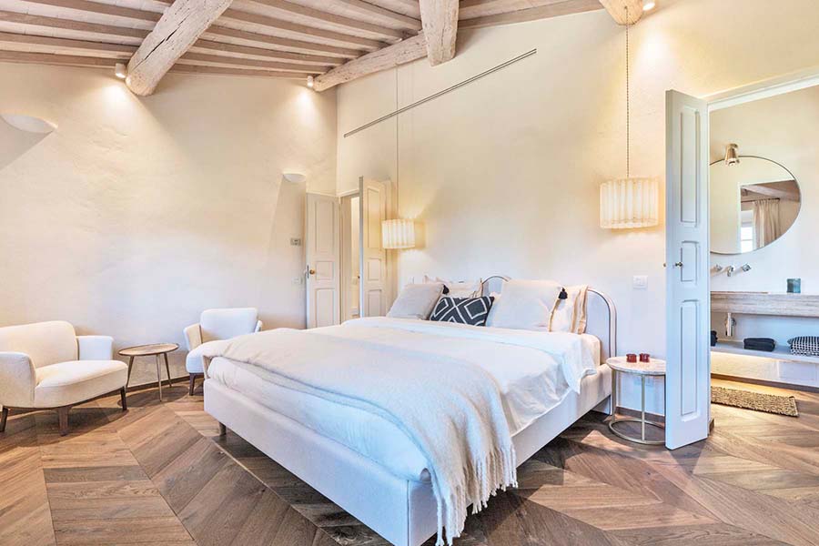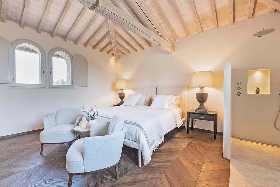 Three of the villa's five double bedrooms are located directly off this living area, including the master suite with its own private entrance. This floor also features two further light and airy double bedrooms, each with its own modern travertine bathroom. A second, equally luxurious master suite is located on the ground floor and features three sets of French doors leading to the olive grove. This spacious suite also boasts classic chevron parquet flooring and a generous bathroom with a freestanding bathtub. For the fifth and final bedroom, the owners created a magnificent contemporary master bedroom in the property's original tower. This room, accessible via the beautifully preserved wooden staircase, offers breathtaking 360-degree views over the entire estate.