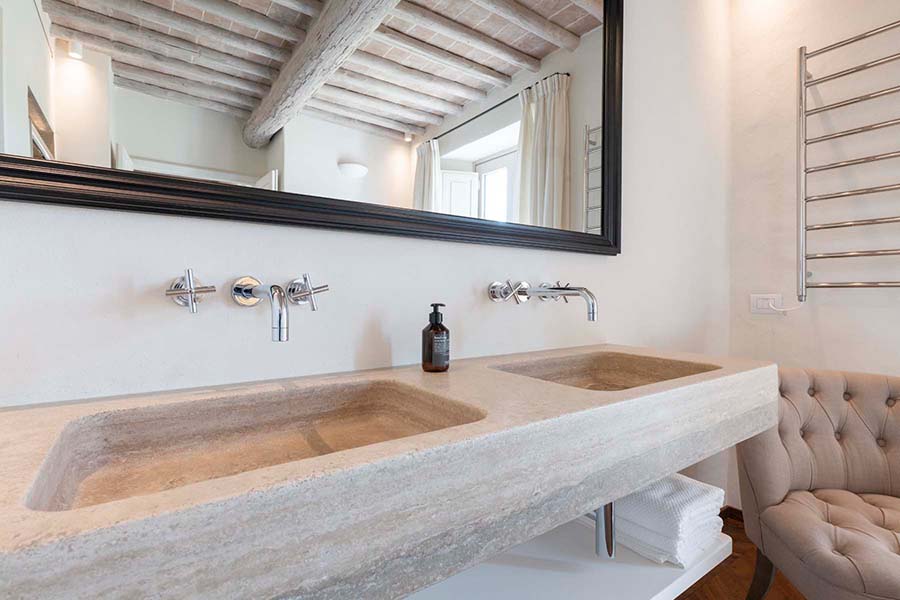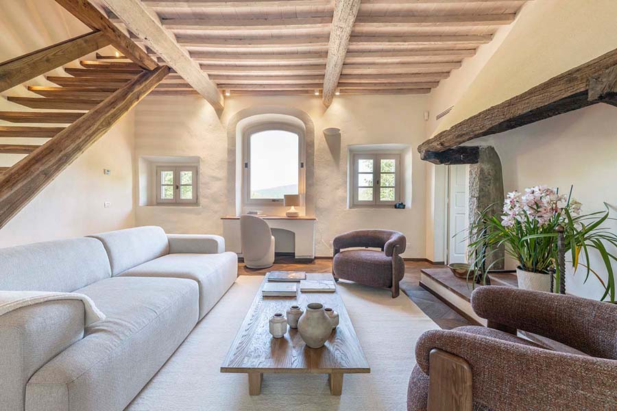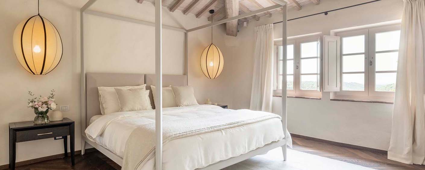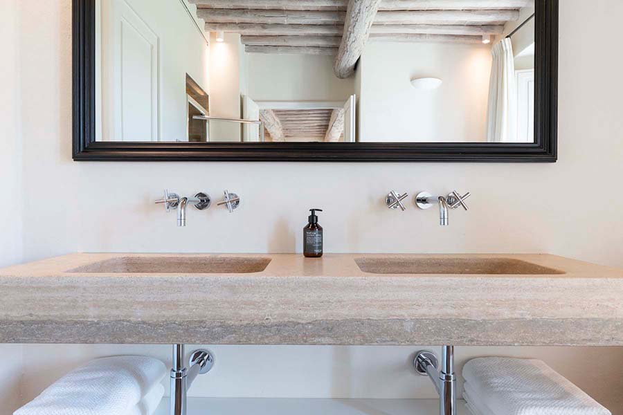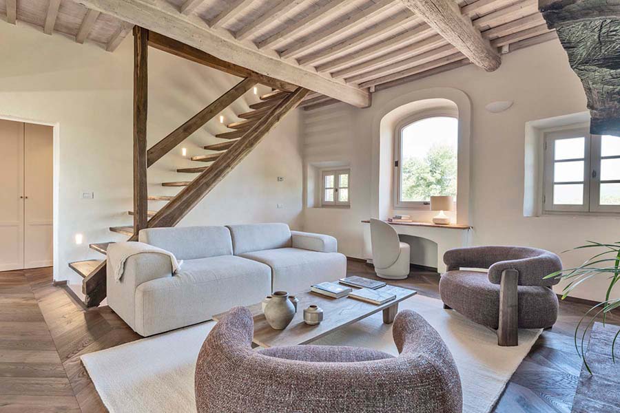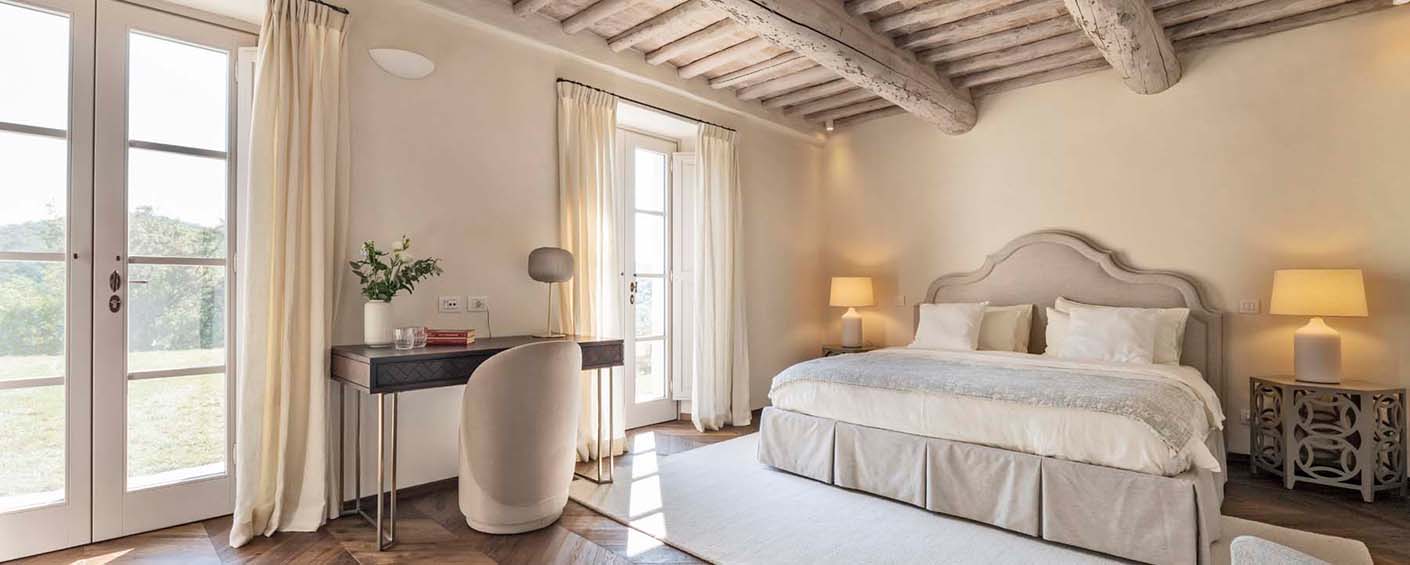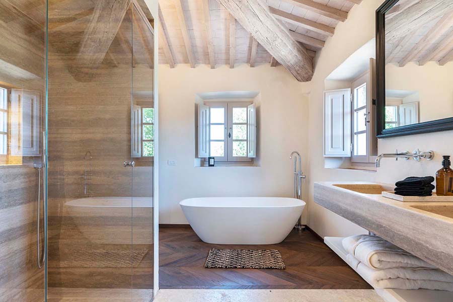 Three of the villa's five double bedrooms are located directly off this living area, including the master suite with its own private entrance. This floor also features two further light and airy double bedrooms, each with its own modern travertine bathroom. A second, equally luxurious master suite is located on the ground floor and features three sets of French doors leading to the olive grove. This spacious suite also boasts classic chevron parquet flooring and a generous bathroom with a freestanding bathtub. For the fifth and final bedroom, the owners created a magnificent contemporary master bedroom in the property's original tower. This room, accessible via the beautifully preserved wooden staircase, offers breathtaking 360-degree views over the entire estate.