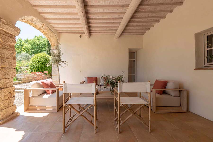 - Adjacent to this living area is another covered loggia with comfortable seating for guests.