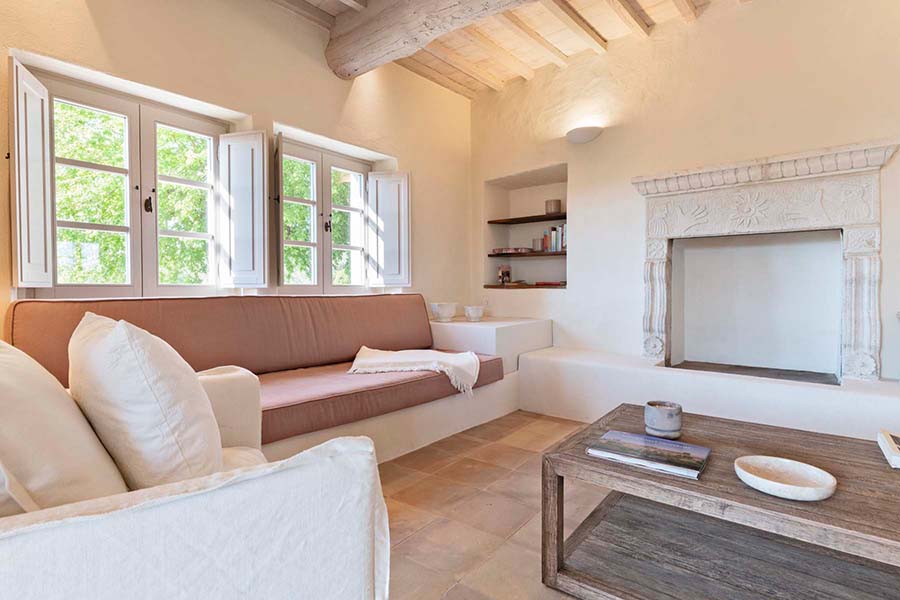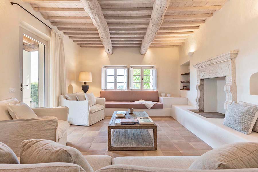 - Spacious double living room with an open fireplace, five sets of French doors lead from the main living level lead to the villa's majestic outdoor areas, including a traditional Tuscan pergola with a built-in oak table