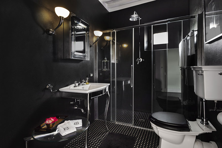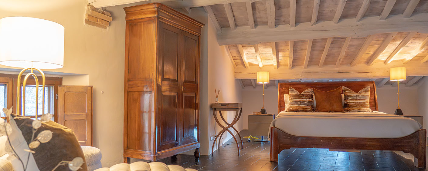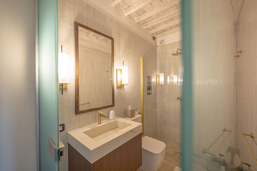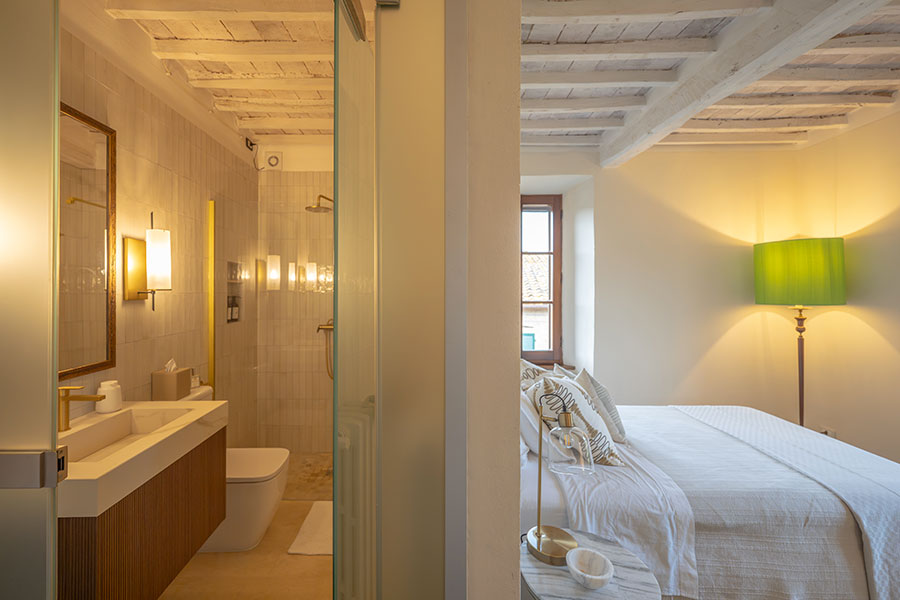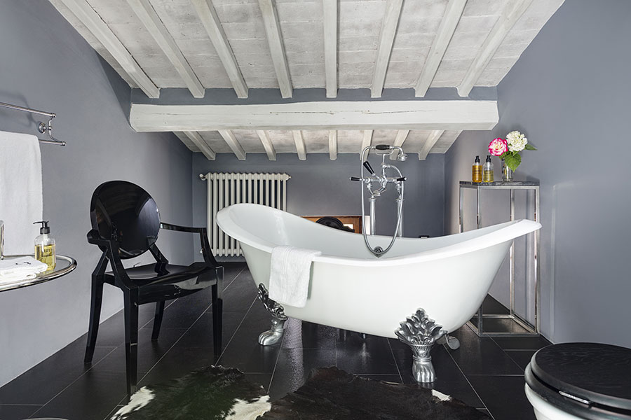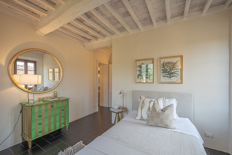 In the attic, one floor further up, is the master bedroom, which has an ensuite bathroom with a with a clawfoot tub. All bathroom fixtures are designed in the classic style of the Florentine company Devon & Devon, and all bedrooms are are air-conditioned with individual on demand splits.