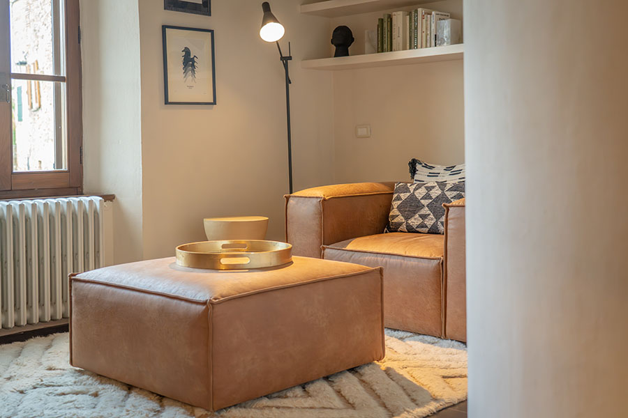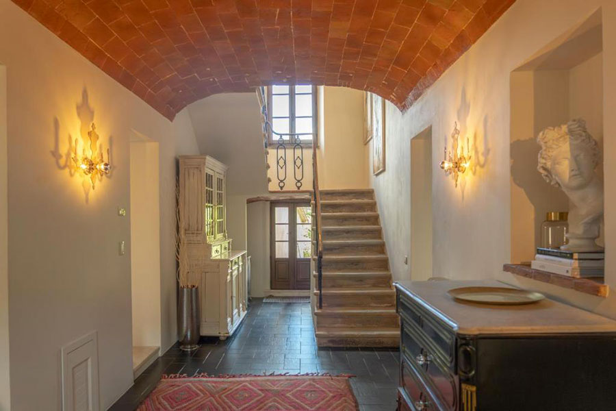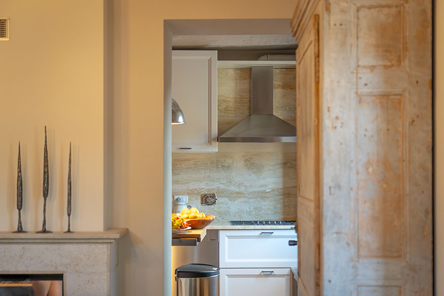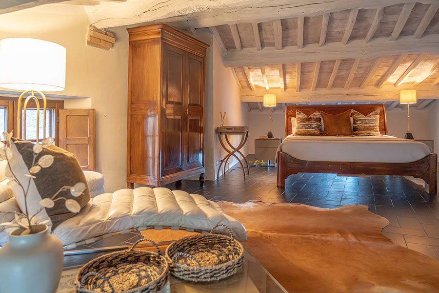 On the ground floor, you'll find the kitchen/dining and the double living room opposite, each with access to its own terrace. Both terraces offer a dining table and lounge chairs for enjoying the garden view. A wood-fired pizza oven separates the two terraces. This can be used upon request by a pizza chef who will come to the house and cook for you. The well-equipped kitchen is separated from the dining room by a small fireplace. The first bedroom is located on the ground floor and features a king-size bed and a full bathroom directly across the hallway. The room has a view of the stone entrance that enters the village.