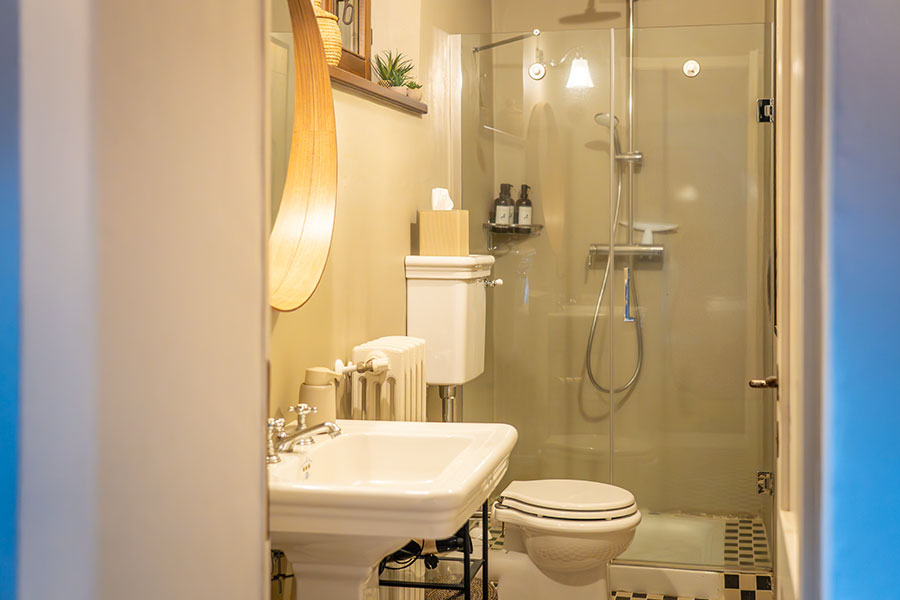 Upstairs, there are three bedrooms. A double and a single share a bathroom with a large walk-in shower. Opposite, there is another double bedroom with an ensuite bathroom and a study, just in case you need to do some work during your stay.
