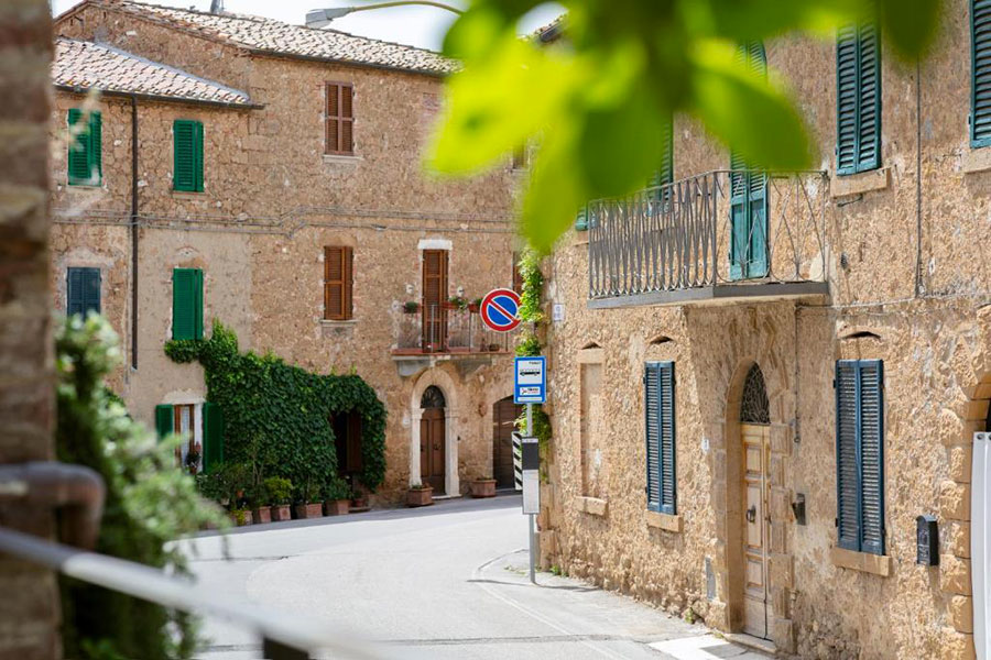 Castemuzio, is situated on the top of a hill of tuff overlooked by Mount Lecceto and facing the green valleys of Trove. It has the typical medieval structure of a fortified castle, walls and bastions. At the entrance of the town before a brief climb which leads to the entrance door, inserted in a war memorial, is the stone on which San Bernardino from Siena used to stand. The old door has the original “gangari” to open and close it and the spots from which the big stones were thrown to defend from attacks. The most interesting building resides in the central square: the tower which currently homes the Palazzo Fratini, recently restructured, which was once the court rooms; the Spedale di San Giovanni Battista which welcomed wayfarers and orphans offering them a place to stay and food as well as providing the dowry for girls without means; and the site of the Brotherhood of the SS. Trinita and of San Bernardino, which were attached to the pharmacy and a four bed hospice for pilgrims who walked to the nearby via Francigena.