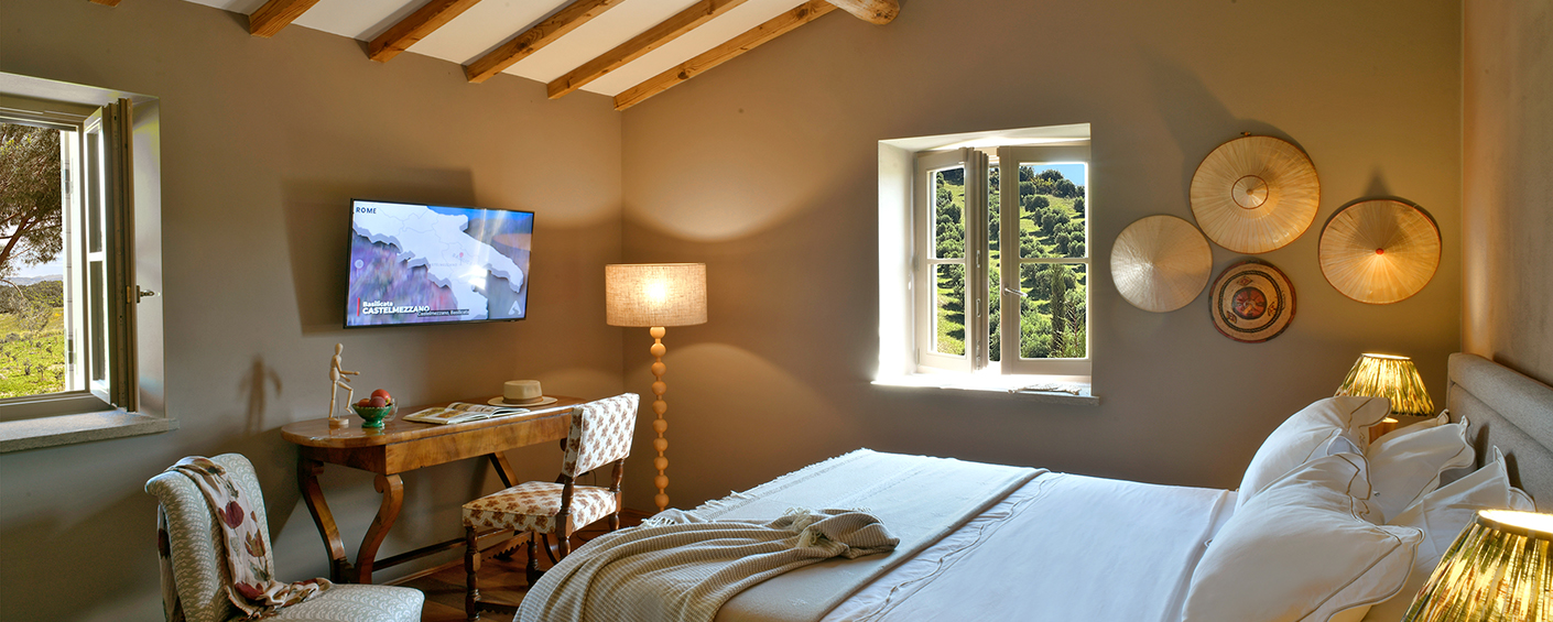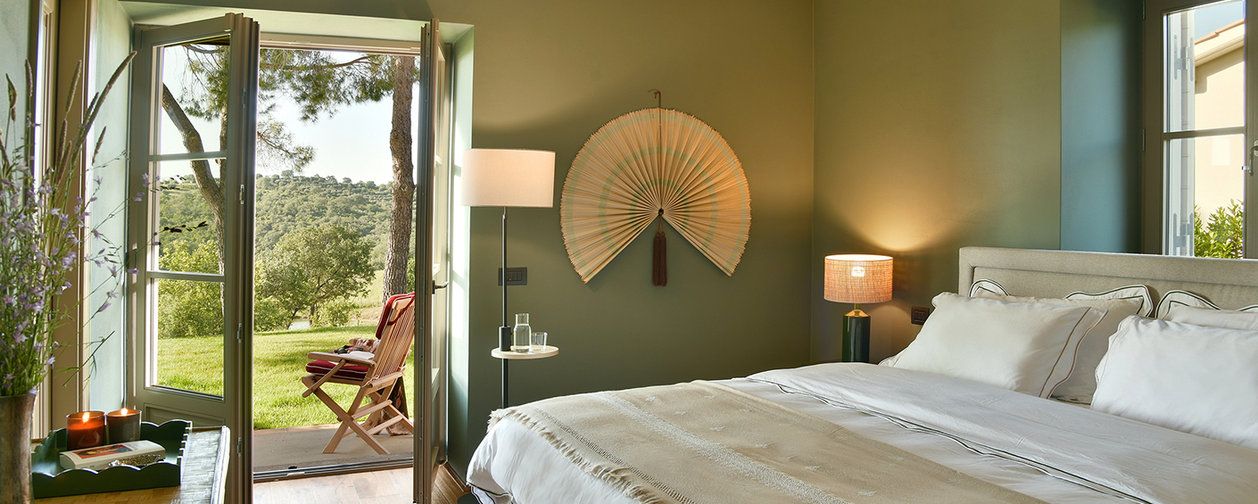 The main villa contains three bedrooms while the separate annex provides two additional bedrooms. All five bedrooms feature private terraces and countryside views. The master suite features sage-coloured walls, exposed ceiling beams, and French doors opening to a private outdoor space.